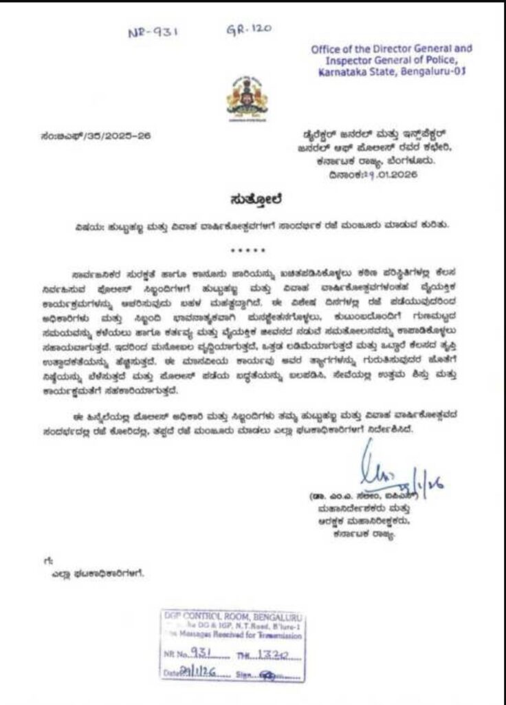 ಇನ್ನು ಮುಂದೆ ರಾಜ್ಯದ ಪೊಲೀಸ್ ಸಿಬ್ಬಂದಿಗಳು ತಮ್ಮ ಹುಟ್ಟುಹಬ್ಬ ಮತ್ತು ವಿವಾಹ ವಾರ್ಷಿಕೋತ್ಸವದ ದಿನಗಳಲ್ಲಿ ಸಾಂದರ್ಭಿಕ (ಕ್ಯಾಸುಯಲ್) ರಜೆಯನ್ನು ಪಡೆಯಲು ಅರ್ಹರಾಗಿದ್ದಾರೆ. ಈ ಸಂಬಂಧ ಕರ್ನಾಟಕ ಪೊಲೀಸ್ ಮಹಾನಿರ್ದೇಶಕರು (DGP) ಅಧಿಕೃತ ಸುತ್ತೋಲೆಯನ್ನು ಹೊರಡಿಸಿದ್ದಾರೆ.