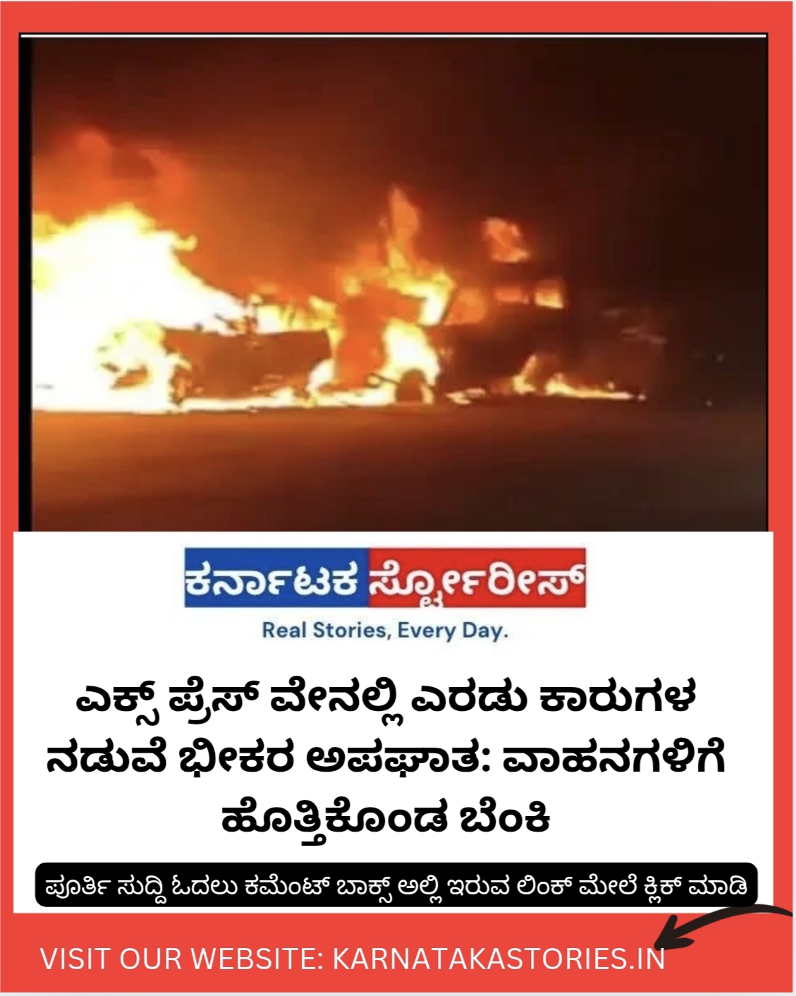 ಎಕ್ಸ್ ಪ್ರೆಸ್ ವೇನಲ್ಲಿ ಎರಡು ಕಾರುಗಳ ನಡುವೆ ಭೀಕರ ಅಪಘಾತ: ವಾಹನಗಳಿಗೆ ಹೊತ್ತಿಕೊಂಡ ಬೆಂಕಿ
